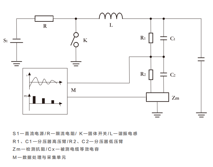 通過(guò)在被試電纜主絕緣上施加衰減振蕩電壓,在此試驗(yàn)電壓下,缺陷電纜受激發(fā)產(chǎn)生局部放電信號(hào),利用研制的電纜振蕩波局部放電檢測(cè)系統(tǒng)進(jìn)行局部放電檢測(cè),發(fā)現(xiàn)電纜缺陷。同時(shí),局部放電脈沖向電纜兩端傳播,利用局部放電脈沖到達(dá)檢測(cè)單元的時(shí)間差實(shí)現(xiàn)局部放電缺陷的精確定位。